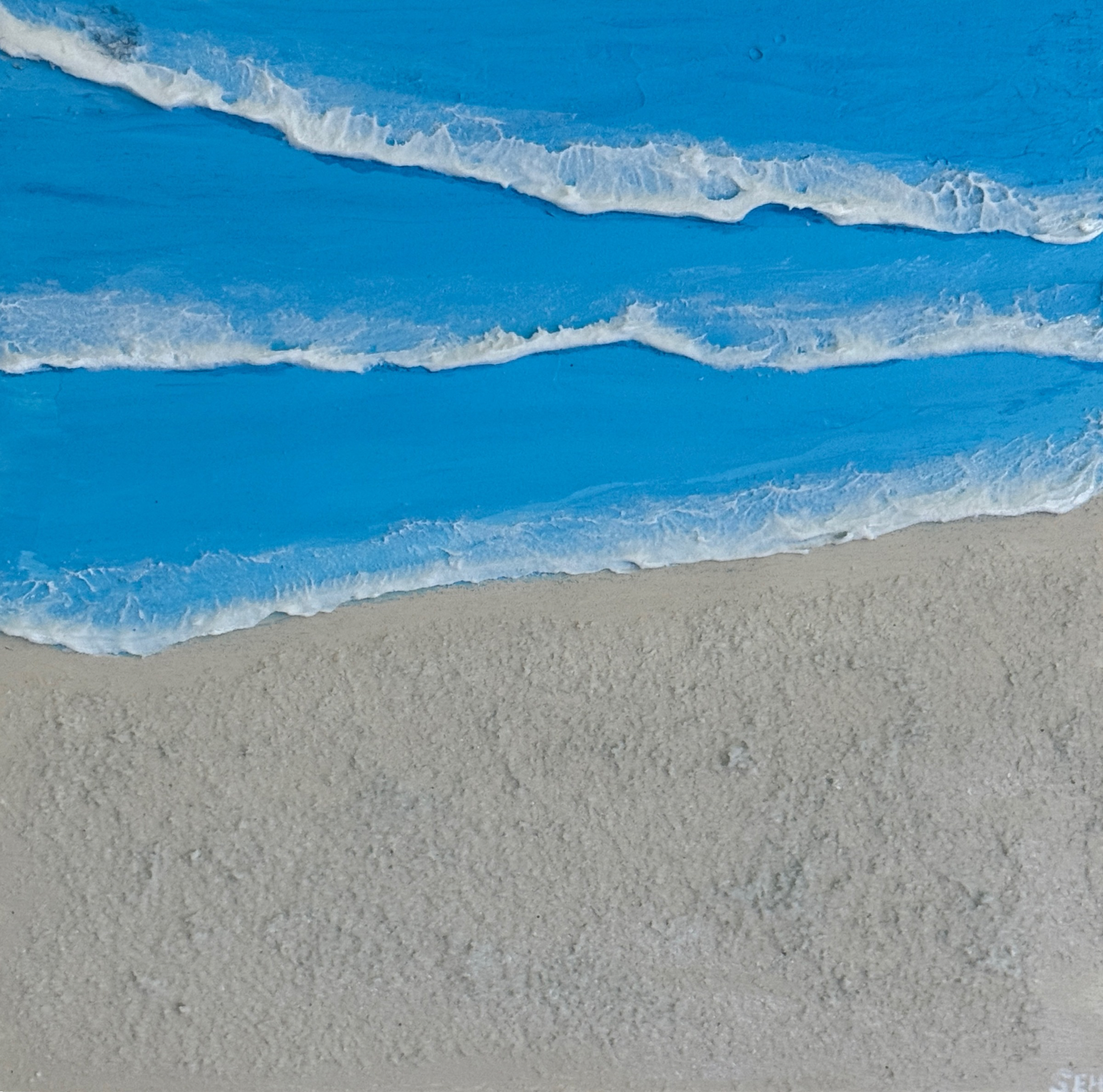 This coastal miniature captures the moment where the first waves meet the quiet shoreline. Layered textures and bright ocean blues create depth and movement, while the sandy surface invites the viewer to step into the scene.