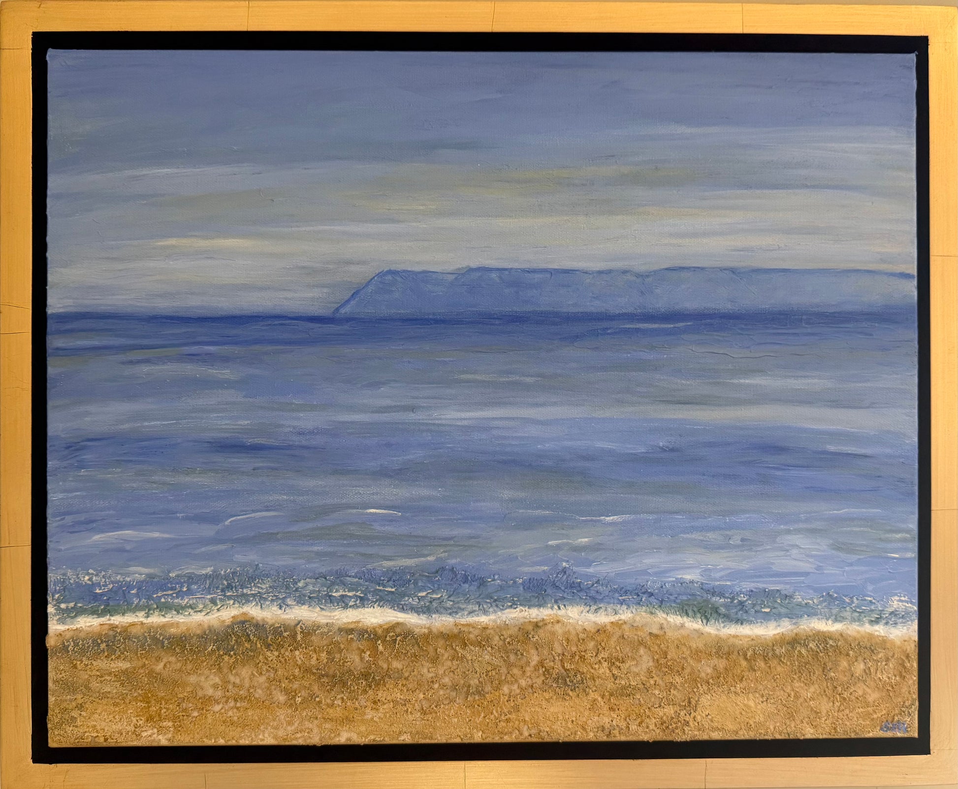 Island Stillness captures the calm and quiet of a shoreline morning, where soft waves roll in. Textured sand meets calming blue waters, inviting a moment of pause and presence. Framed in gold leaf, it's a serene seascape-rooted in peace, stillness and coastal simplicity.