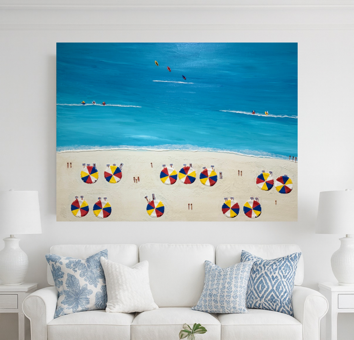 Inspired by the iconic La Jolla Beach & Tennis Club, this aerial shoreline view celebrates the vibrant spirit of coastal life in San Diego. La Jolla Sunshine bursts with playful energy — bold red, yellow, and blue umbrellas dotting the sand and families/friends enjoying the day across turquoise waters.