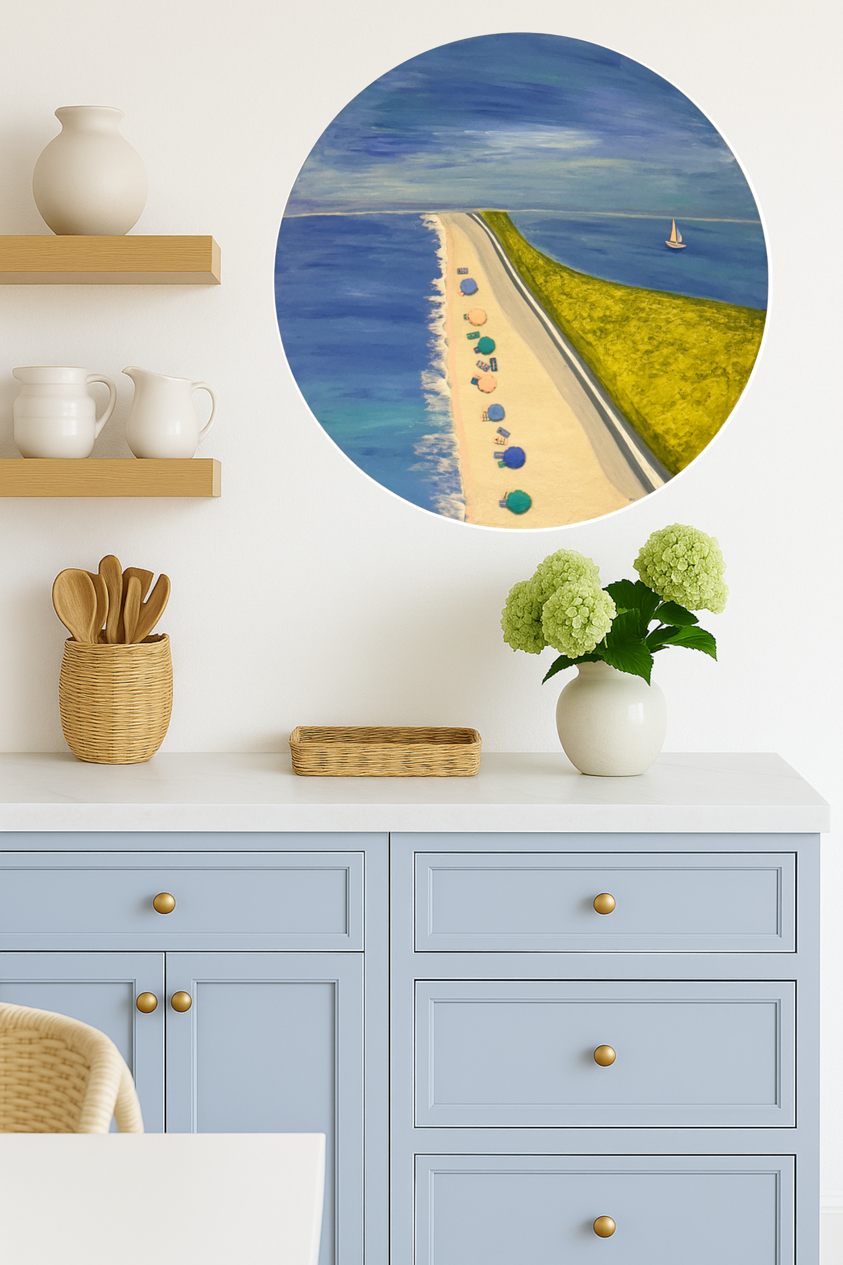 “Path of Passion” is a circular mixed media painting that celebrates the serenity and joy found in movement and nature. Inspired by my runs along the Coronado Strand, the composition follows a winding coastal path embraced by the deep blue ocean on one side and vibrant green dunes on the other. Along the shoreline, colorful umbrellas and beach goers invite a sense of leisure and connection, while a distant sailboat drifts across the horizon. The textured, layered surface deepens the tactile connection to sand, sea, and sky, encouraging viewers to feel the rhythm and freedom of the California coast. This work is a reflection on peace, and the beauty of motion carried by the sea breeze.
