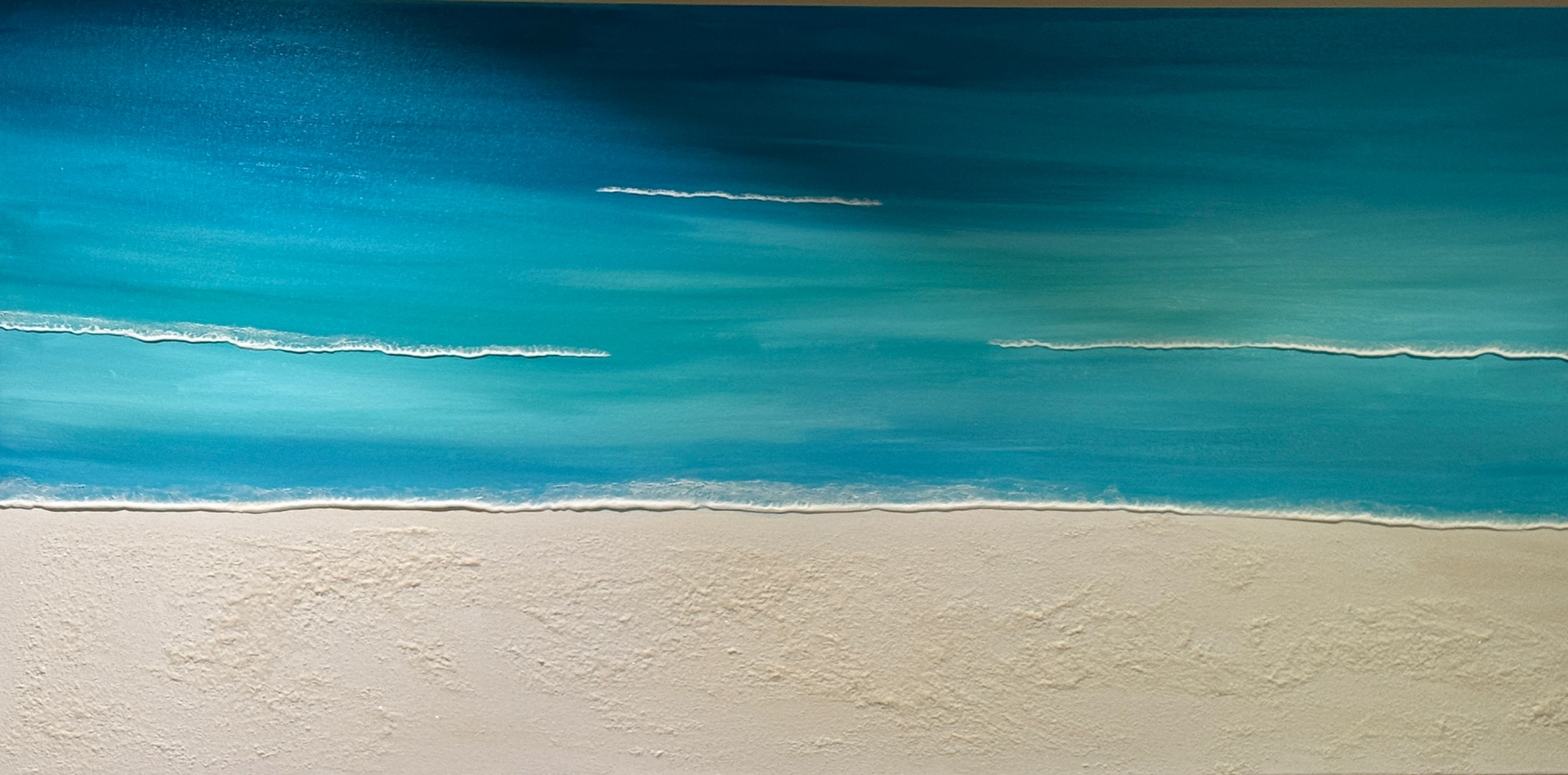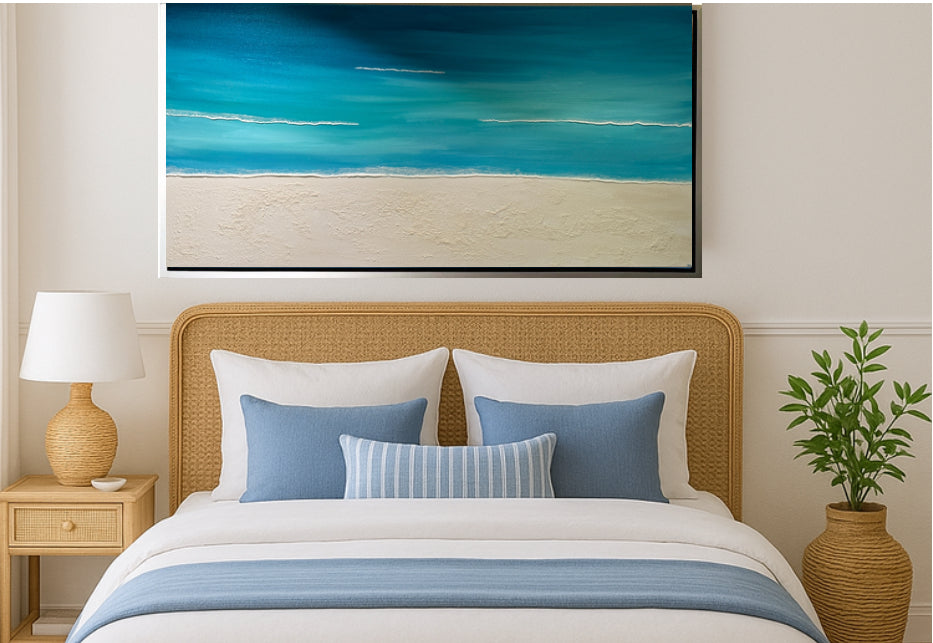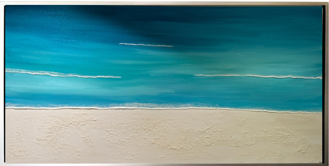 Salt and Serenity is a meditation on the quiet beauty of the shoreline — where gentle waves meet soft sand, and the horizon stretches endlessly ahead. With its wide panoramic format, this painting evokes calm and openness.