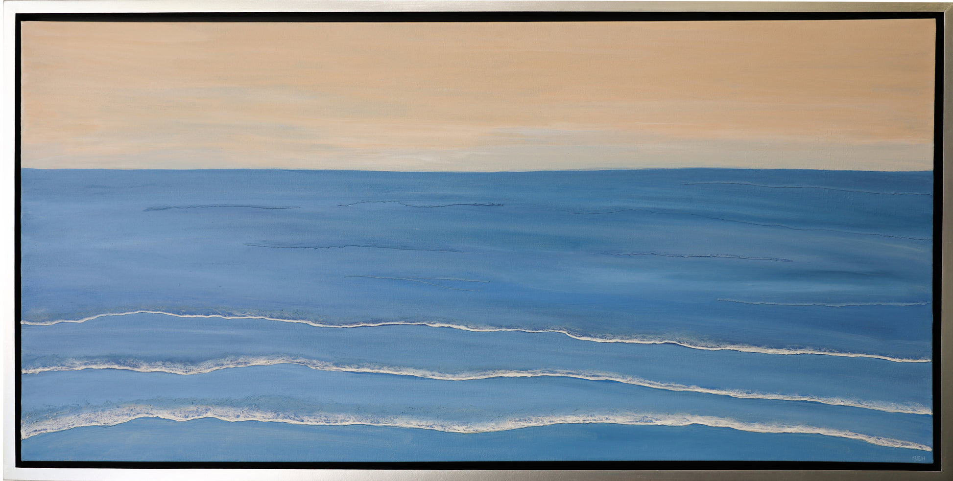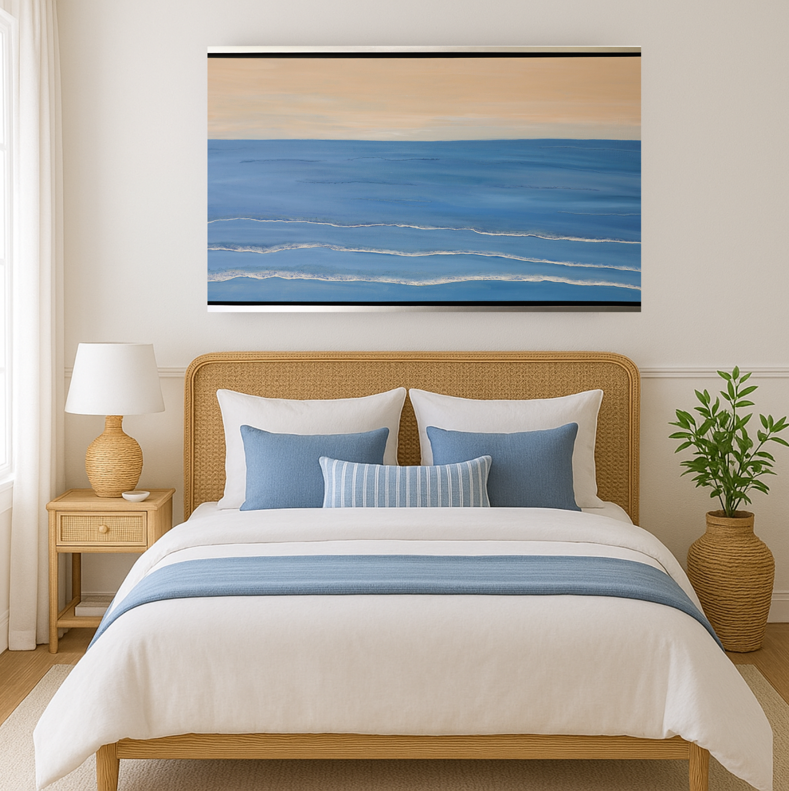 "Serenity" is a calming acrylic textured painting that captures the quiet elegance of the ocean in stillness. Gentle waves roll in rhythmic layers across a vast expanse of deep blue, meeting a tranquil horizon softened by warm beige skies. The textured brushwork in foreground adds depth and realism, while the smooth gradient of the water draws the viewer into a peaceful, meditative space. This piece evokes the healing quiet of the sea, offering a sense of calm and clarity- perfect for creating a tranquil atmosphere in any space.