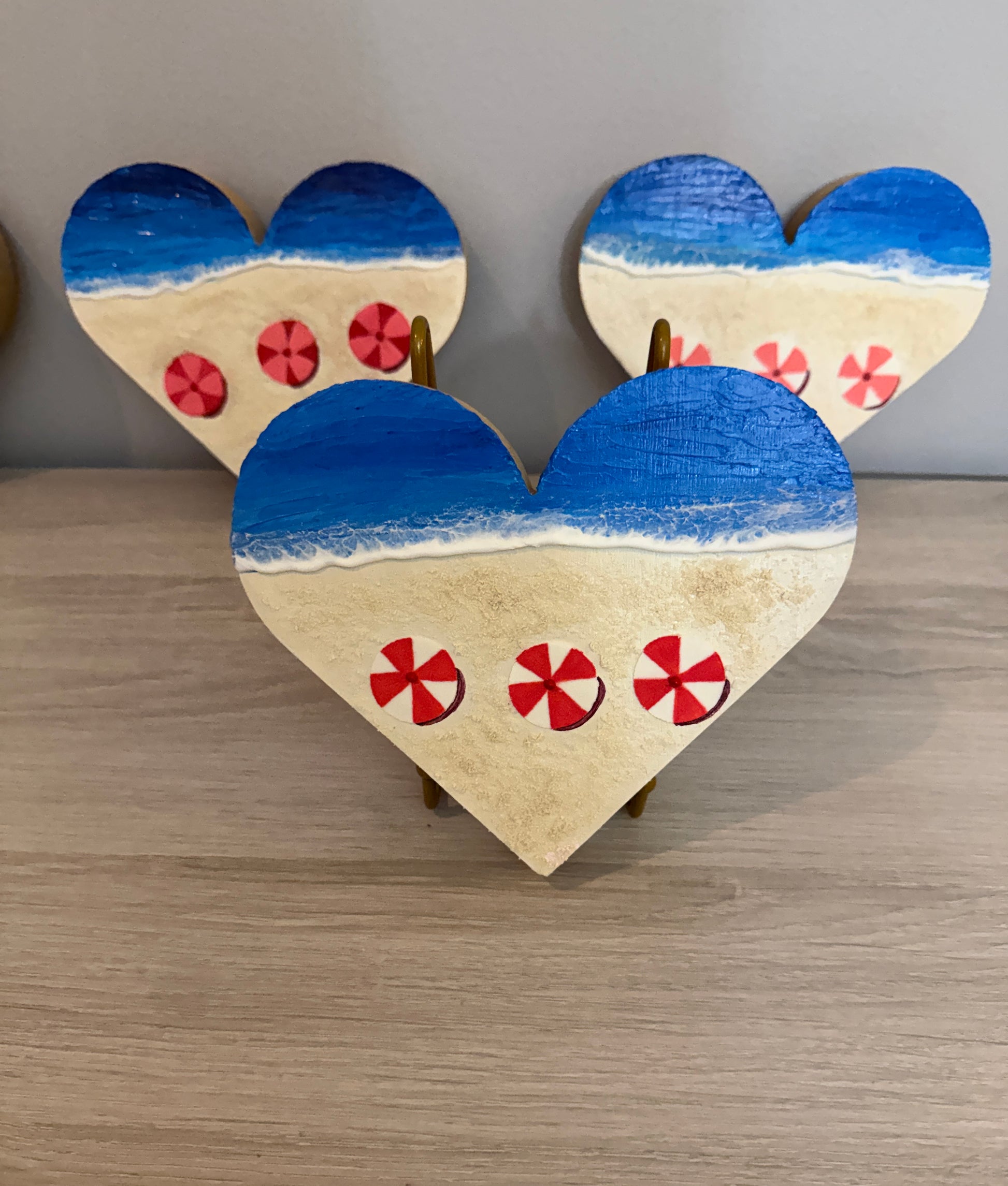 This piece is part of the Heart Series, exploring love as comfort, protection, and quiet presence. Painted in acrylic on a 6 x 6 inch heart-shaped birch wood panel, the work features layered ocean blues, soft sandy textures, and umbrella motifs that symbolize shelter, care, and the people who hold us steady.