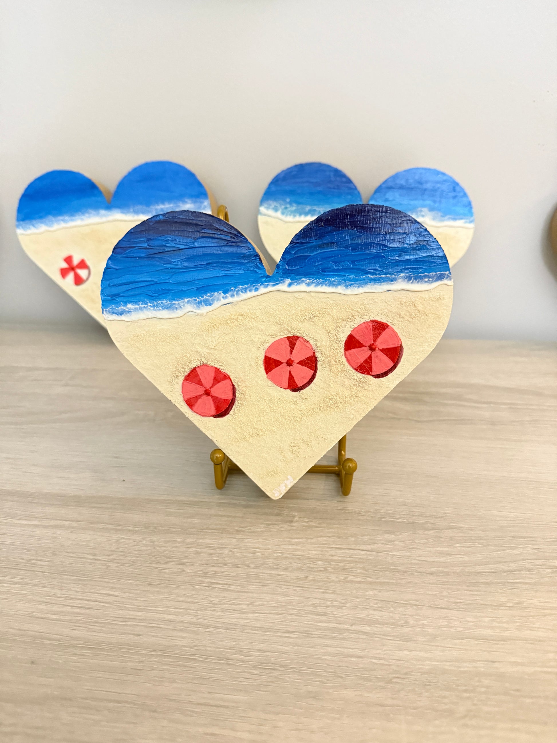 This piece is part of the Heart Series, exploring love as comfort, protection, and quiet presence. Painted in acrylic on a 6 × 6 inch heart-shaped birch wood panel, the work features layered ocean blues, soft sandy textures, and umbrella motifs that symbolize shelter, care, and the people who hold us steady.