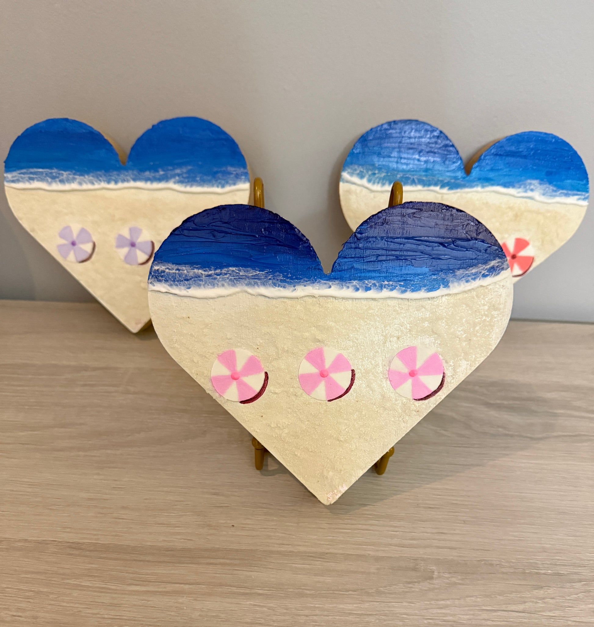 This piece is part of the Heart Series, exploring love as comfort, protection, and quiet presence. Painted in acrylic on a 6 x 6 inch heart-shaped birch wood panel, the work features layered ocean blues, soft sandy textures, and umbrella motifs that symbolize shelter, care, and the people who hold us steady.